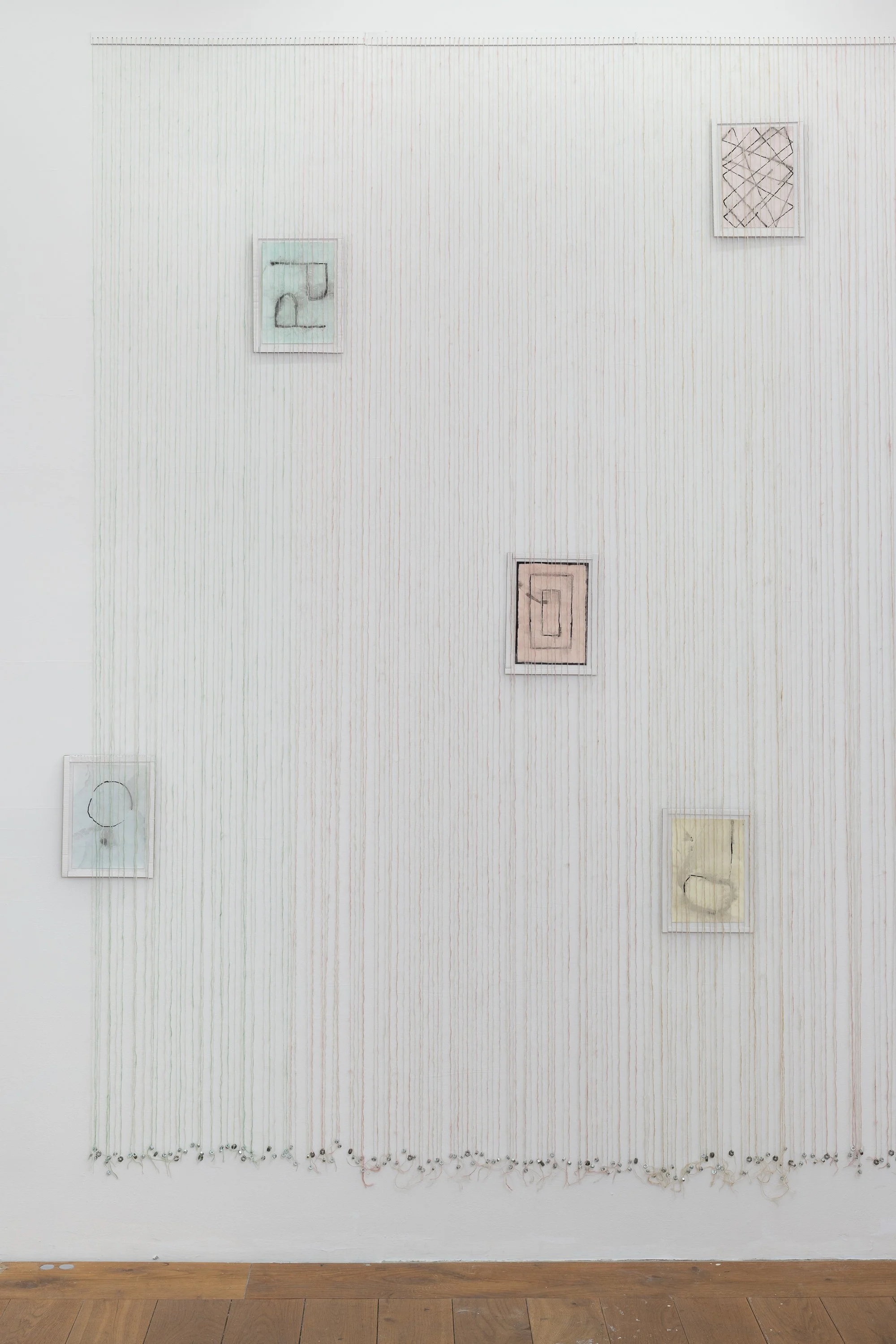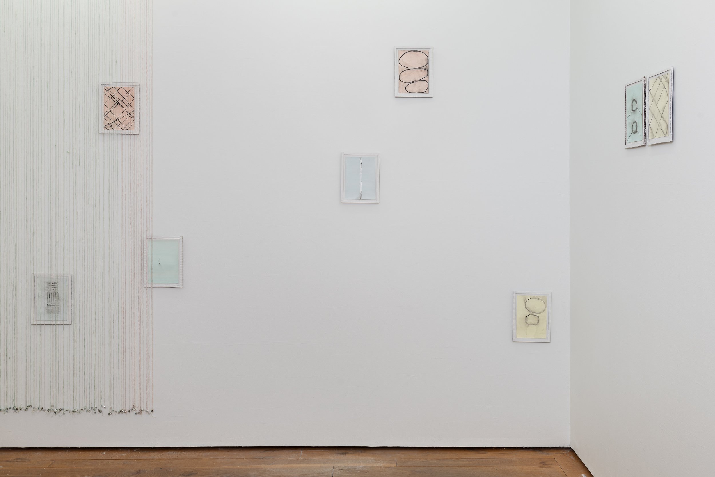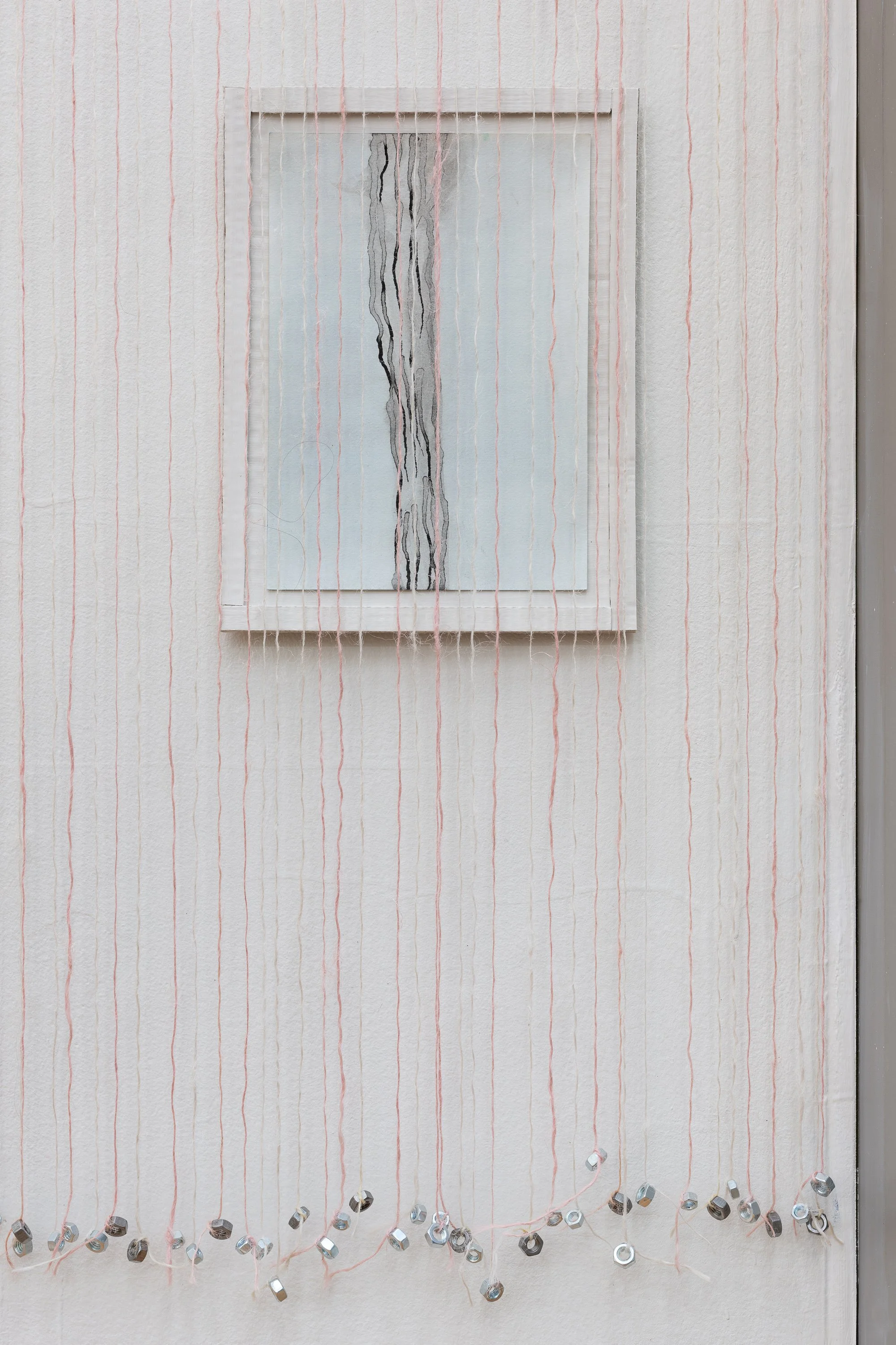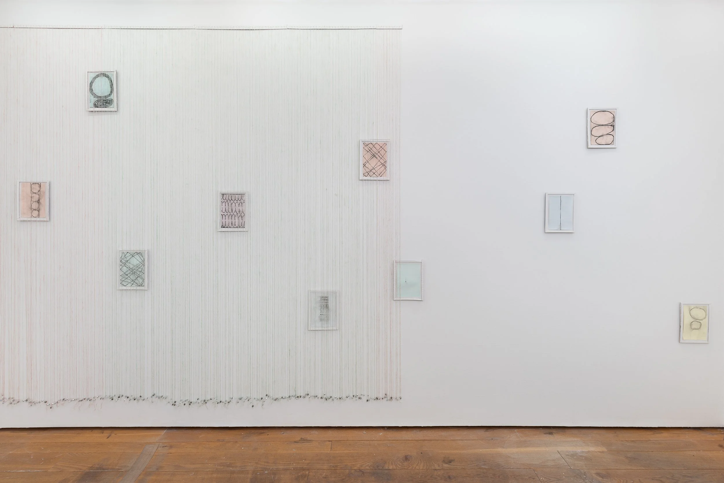 Blekktegningene er montert i samtale med tråder som henger fra tak til gulv og danner et transparent sjikt foran veggen. Trådene fungerer både som en fysisk forlengelse av tegningenes linjer og som et filtrerende lag som påvirker betrakterens opplevelse av verkene.