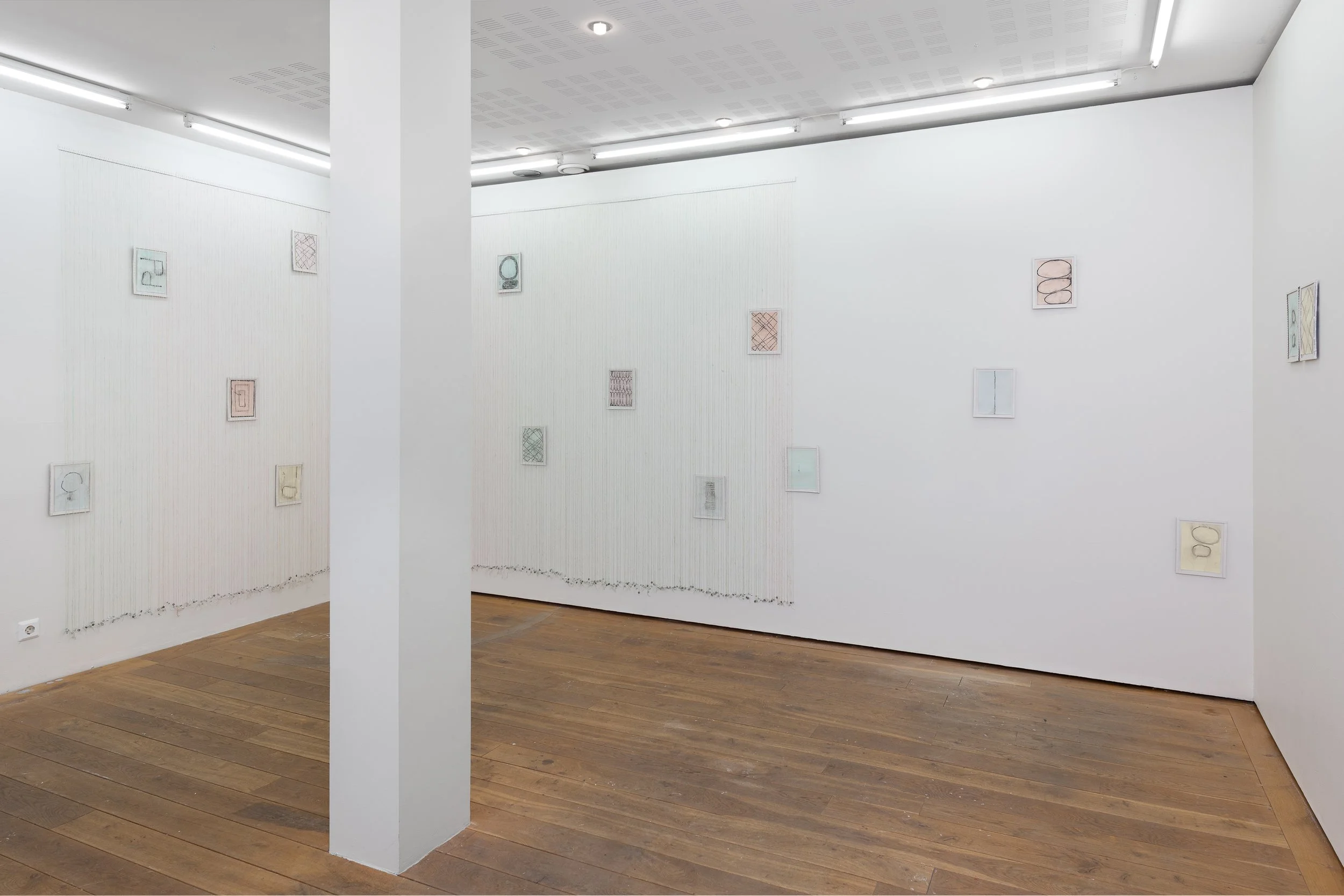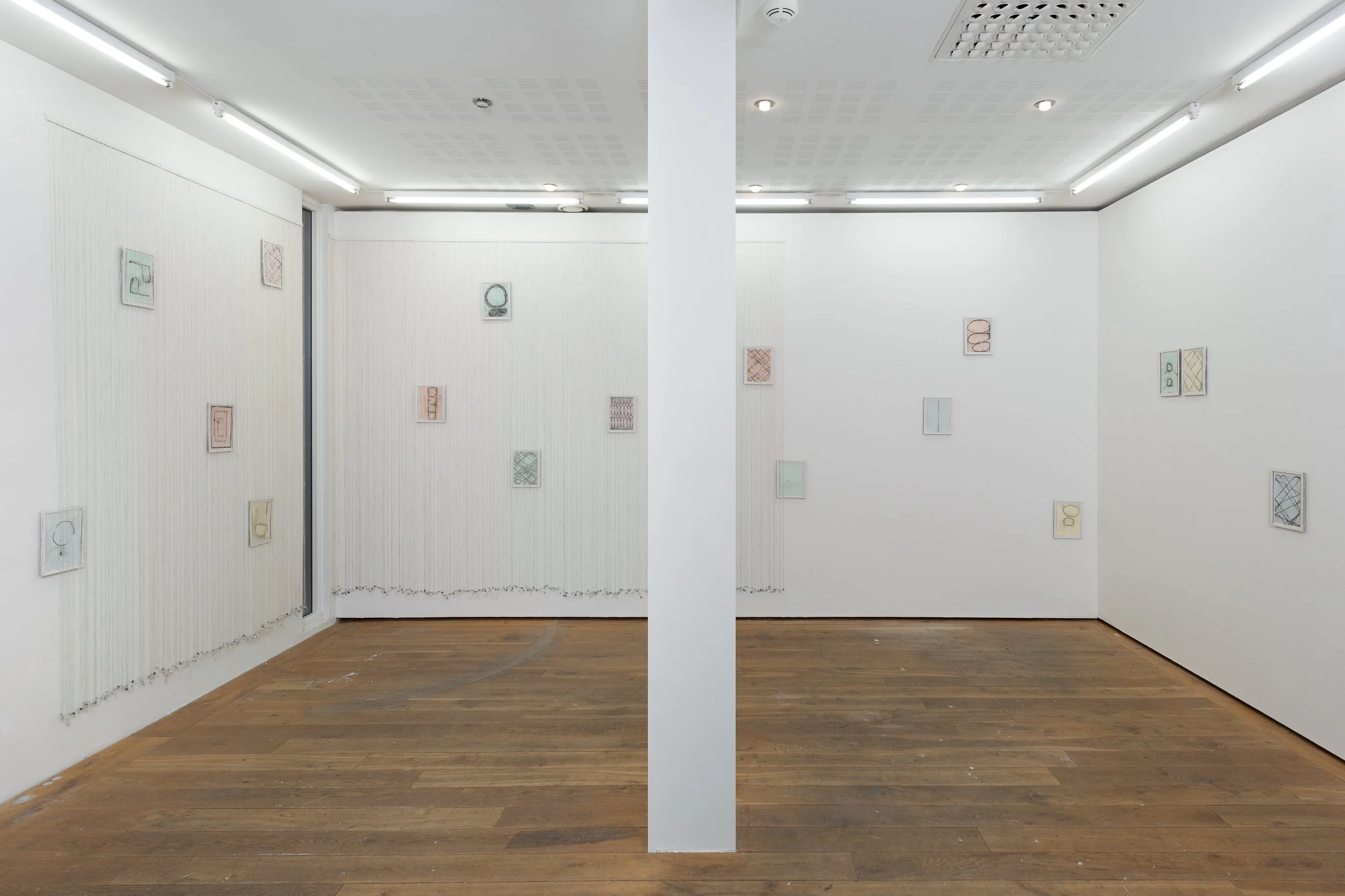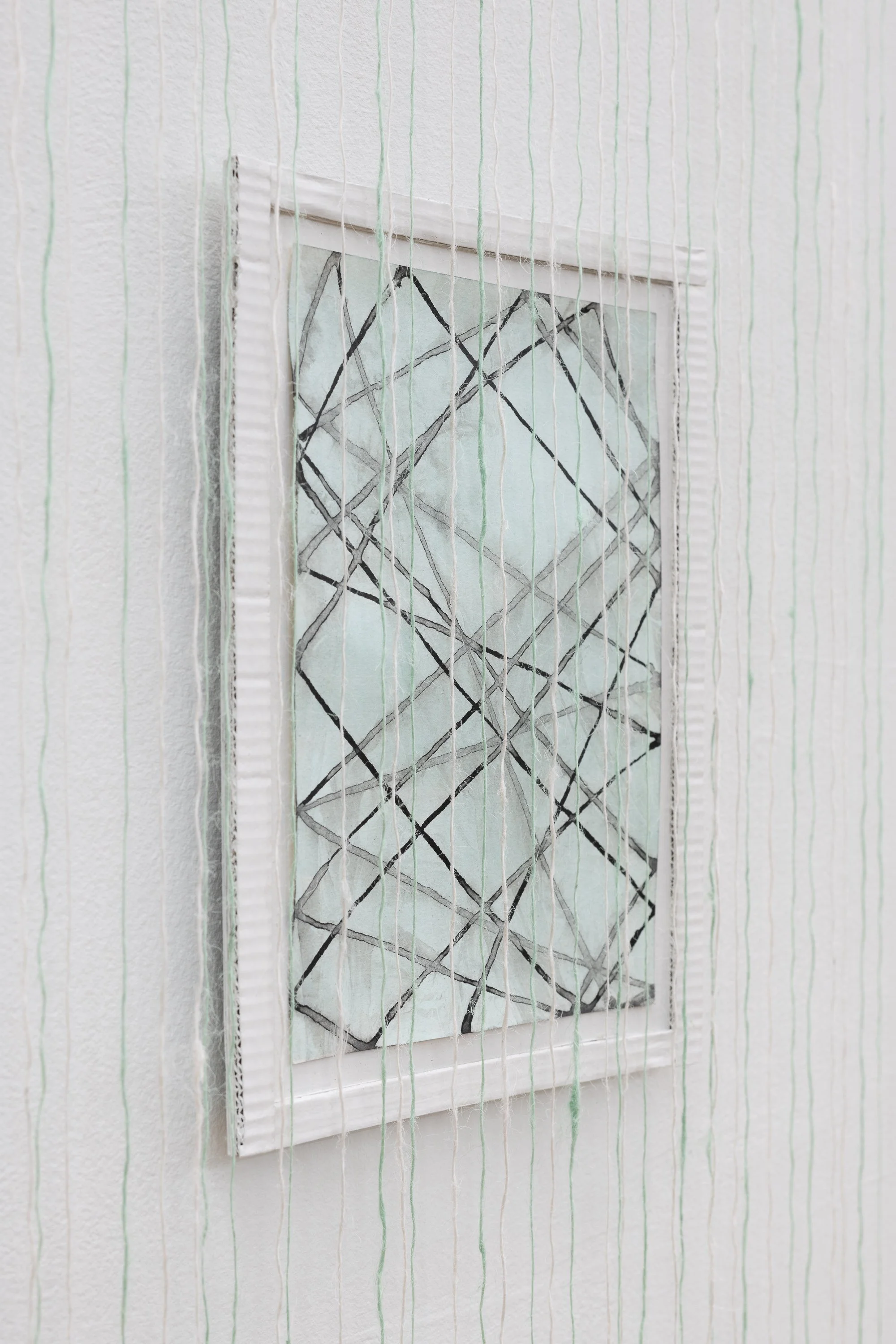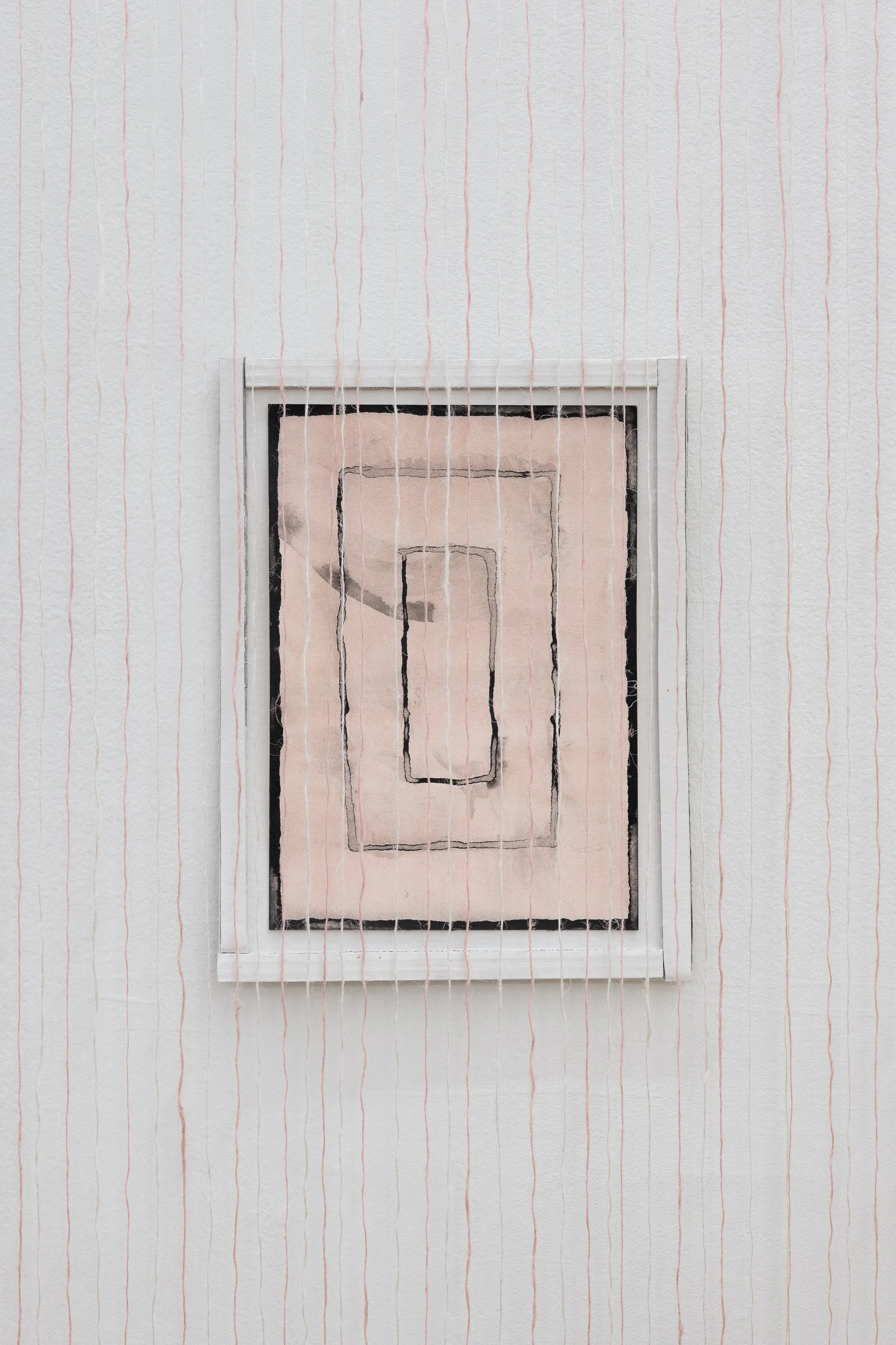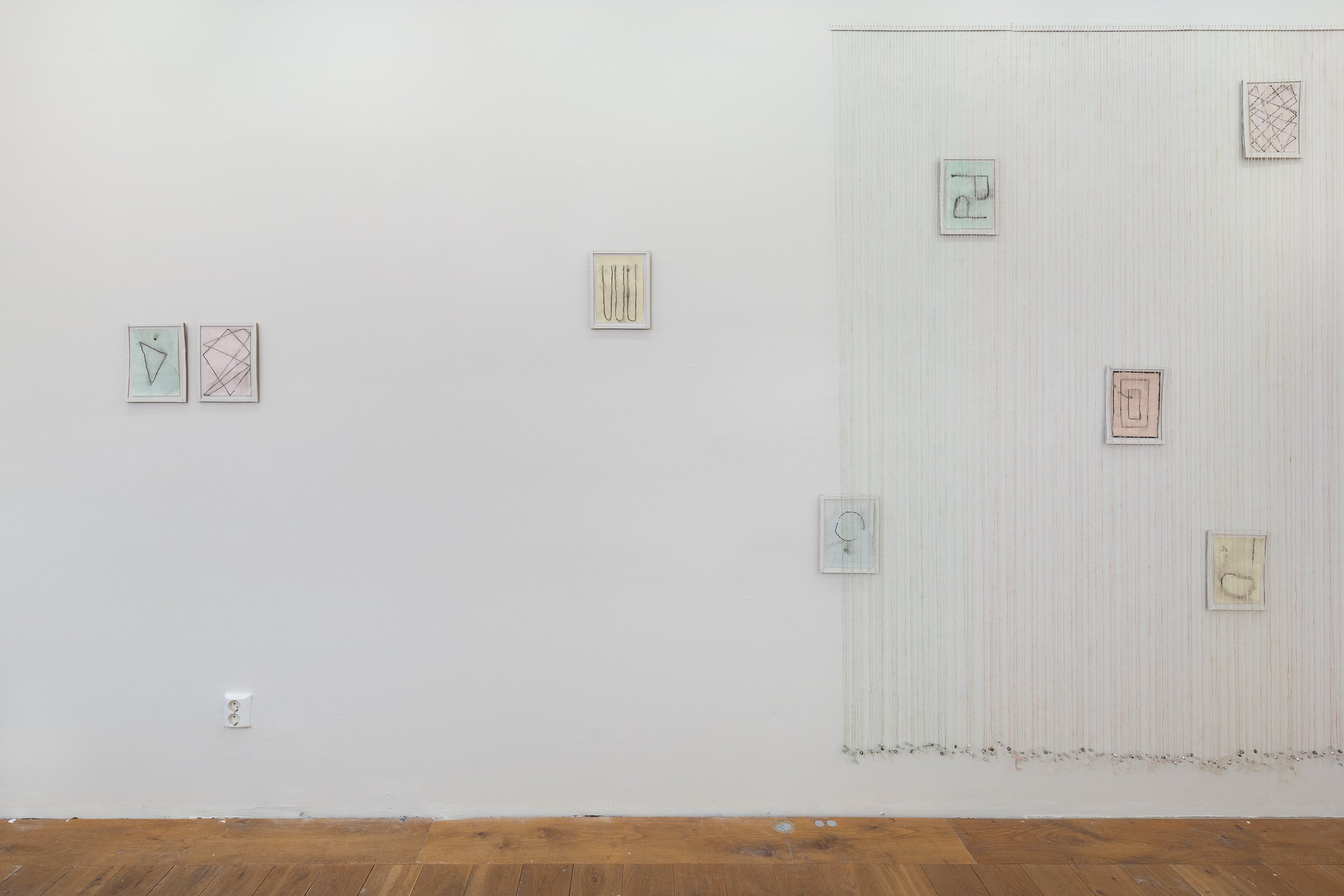 Blekktegningene er montert i samtale med tråder som henger fra tak til gulv og danner et transparent sjikt foran veggen. Trådene fungerer både som en fysisk forlengelse av tegningenes linjer og som et filtrerende lag som påvirker betrakterens opplevelse av verkene.